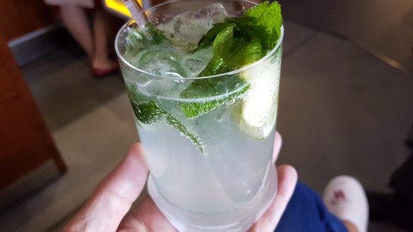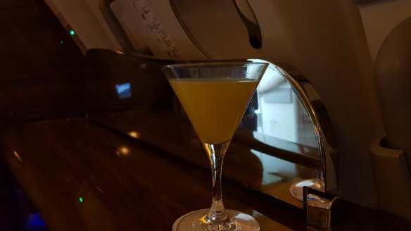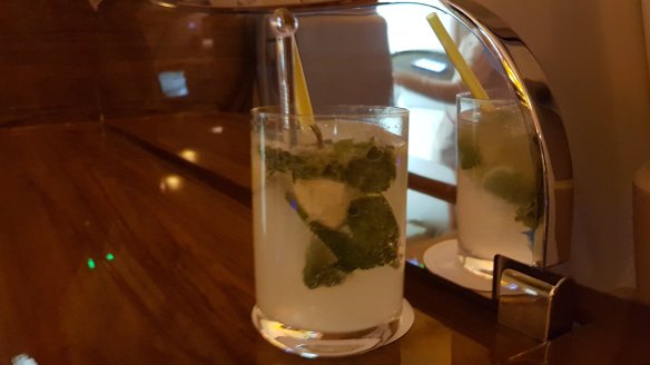 因為貴賓室吃太飽,我決定再次省略便餐(雖然時間這應該是早餐)。不過我還是到空中酒吧坐坐。也不能老是喝Möet,這次我點了座艙長親手做的。Mojoto與Breakfast Martini。