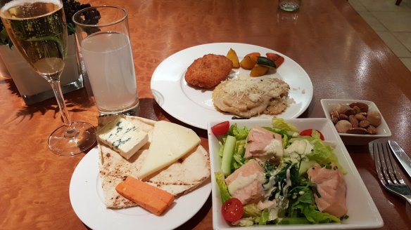 主餐有咖哩牛肉、起司餃、魚排。法蘭克福的炸豬排有名,這邊是雞肉版本。當然整個貴賓室沒有豬肉。