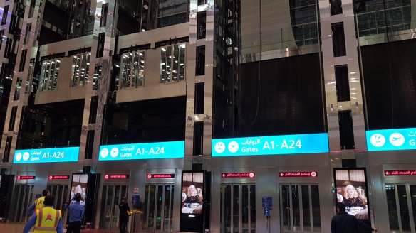 先說整個機場,機場T3是在2008年完成的,經過十年看起來沒有很新。至少在C區設計上不追求寬闊的廊廳,至少我經過的區域大多數沒有大片落地玻璃(沙漠太熱?)。不過,回程從出關入關到A區,情形又不大一樣。