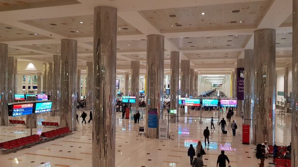 從杜拜機場壯觀的T3降落,搭乘機場接駁電車才到海關。入境大廳蓋的非常壯觀,挑高非常的高。