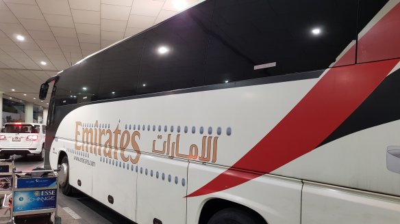 阿布達比的接駁車在出口2的巴士站六號(EXIT 2 BAY 6),因為附近還有其他巴士計程車,不算是太顯眼。車身上有大大的阿聯酋航空字樣。當天人不是很多,司機也沒有檢查我的預約,只是登記了我的登機牌。