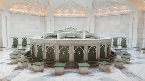 整個大清真寺的印象就是超豪華、超白的。進入正門後,是經過兩邊的迴廊到祈禱廳中。地下室則是廁所,以及好像是洗腳的地方。也是一整個乾淨與豪華。