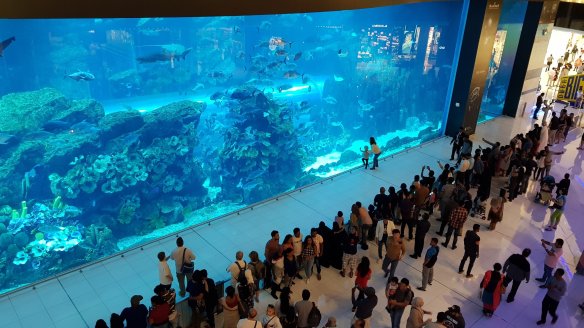 Dubai Mall其他的景點就是眾所週知的大水族箱,鯊魚魟魚游來游去。
