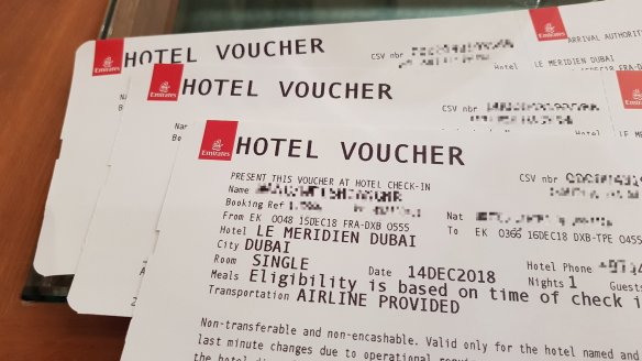 從德國回程是5:50到杜拜,隔天4:55離開,因為在24小時內,所以算是轉機,行李可以直掛台北,也符合Dubai Connect免費食宿要件。