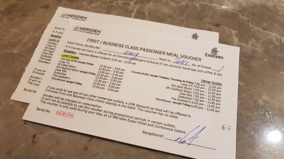Le Meridien Dubai是Resort型態,佔地蠻大的,有六間餐廳提供免費餐飲服務,餐飲抵用劵在旅館內的EK乘客專用櫃檯可以拿,這次拿到中午晚上兩張。