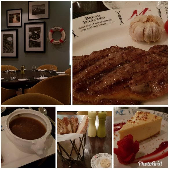 晚餐的餐廳都開的蠻晚到11:30。我選的是牛排店M Beef Bistro,可以選前菜(洋蔥湯)、牛排、甜點(起司蛋糕)。當然也附飲料以及麵包。牛排配上大蒜非常好吃,我甚至請服務生代為像主廚表達敬意。