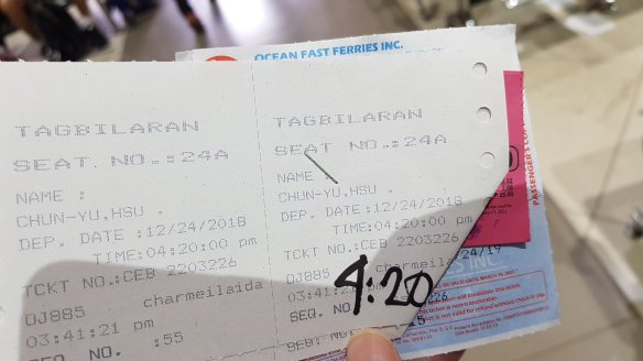 回程在Alona,要訂位費要多50披索。插曲是,我們一開始不甚走進一家門口有中文諮詢字樣的店,當地店員一看到我們就直接叫門口的中文服務人員進來,此君態度很不好,而且訂位費報價是100披索。連我們想用英文再跟菲籍店員詢問問題,都被阻止,要求我們用中文問他。