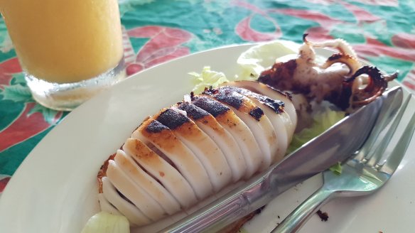 很多人在這邊是點海鮮燒烤,我們來自盛產海鮮的國度,只有點烤花枝下酒。我們比較喜歡Trudis裡面有放洋蔥的版本。
