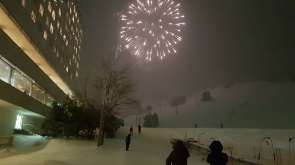 晚上則是夜滑,三號纜車綠線晚上太陡,四號太簡單,我們主要是滑五號。正好是1/2號,在夜滑8:30結束後,8:40有煙火施放。