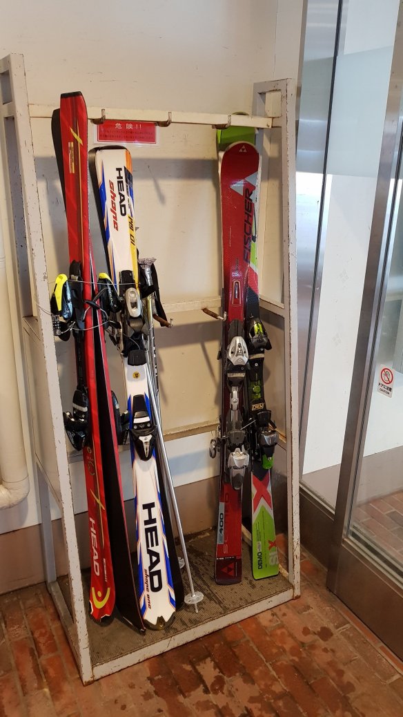 王子飯店的每一間房間都有自己的雪具櫃,我們是外面租的,所以曾經試圖找過有沒有雪具櫃可以使用。在滑雪租借處的更衣區有三個櫃子,但是當然已經有人使用。