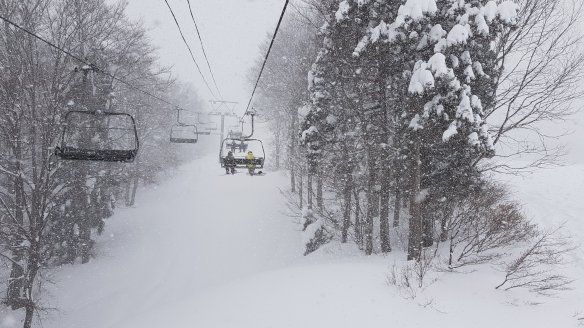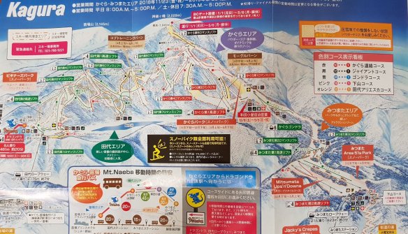 第一天是苗場的所有綠線(上次來因為去田代所以只有去兩三條),加上龍纜車到田代湖白樺。當天太陽只有除了十分鐘,田代的雪還不小,雪鬆鬆地很好滑。