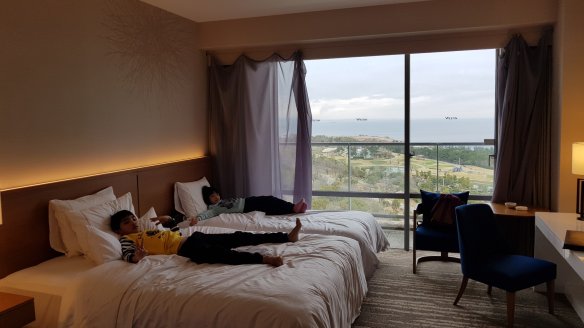 因為是萬豪鈦金卡(之前的特選白金,去年挑戰來的),兩間房都升級到最高樓層邊間,請工作人員打開房間之間的門後,小孩們在房間裡跑來跑去不亦樂乎。