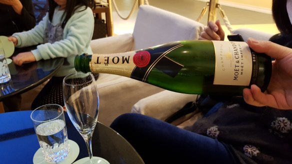 一樣談心拿到四張Lonuge飲料卷。這邊沒有類似行政樓層的貴賓室,Lounge其實就是大廳的咖啡廳。在飲料單上的飲料都可以點,我們無腦地選了酒單上最貴的香檳酒Möet,價格是2100日幣。其實Möet應該沒那麼貴,阿聯酋上都是當開水喝的。