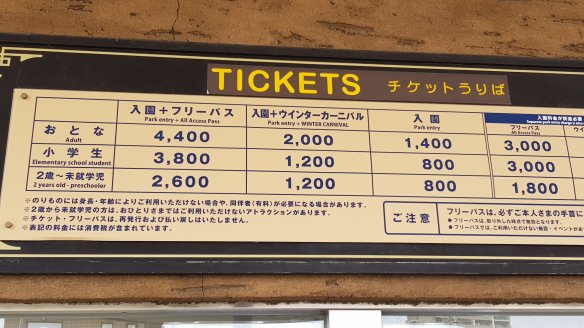 相對於其他主題樂園的一票完到底,枚方公園有一票玩到底,以及入園費加上設施單次付款兩個選項。小孩當然是一票到底,大人我們選擇入園費。小孩是3800日元,大人則是1400日元。