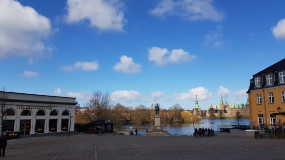從Hillerød到腓特烈堡大概走路要15分鐘,出火車站有小小的標示。附近有一個商店街與賣場,可能是星期天人沒有很多。很快就可以看到人工湖畔遠眺城堡的點。