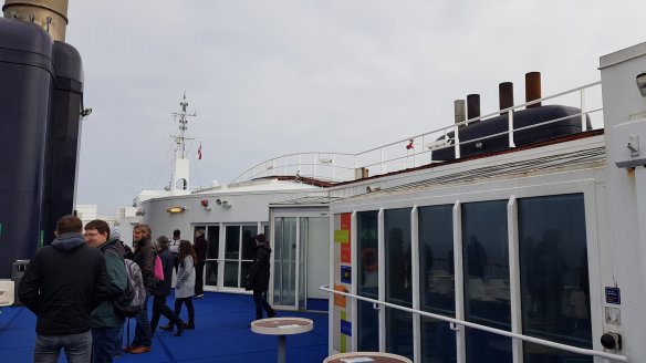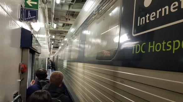往北開了兩個多小時,廣播就說明已經到達海峽,火車要上渡輪,請所有乘客都下車。貌似可以把行李留在火車上,我因為到了丹麥使用的是二等艙,把包包揹下車。