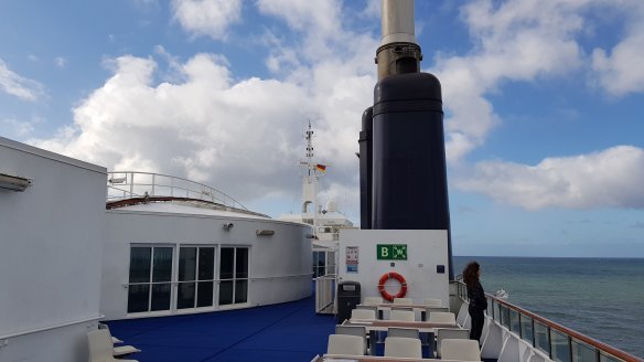 渡輪頂樓則是開放甲板,我去程天氣是白濛濛的一片,回程則是可以看到藍天。
