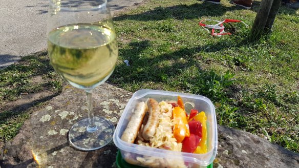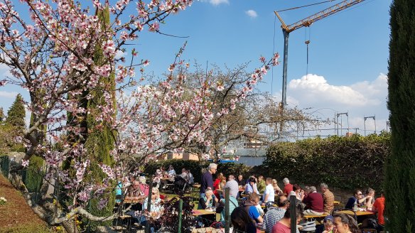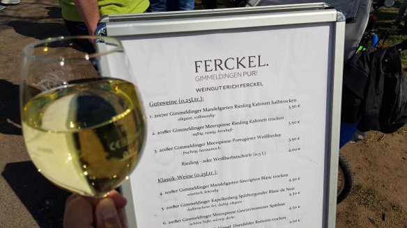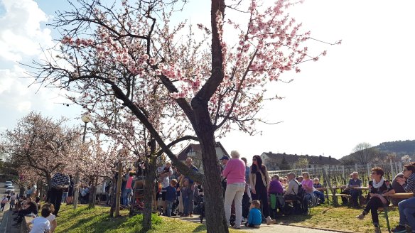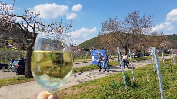 日本的賞花是在櫻花樹下喝清酒,德國當然是在杏花樹下喝葡萄酒了。喝了當地酒莊一杯3.5歐元的白葡萄酒,入口還蠻順口的,之後(也只得)散步一個多小時再開車離開。