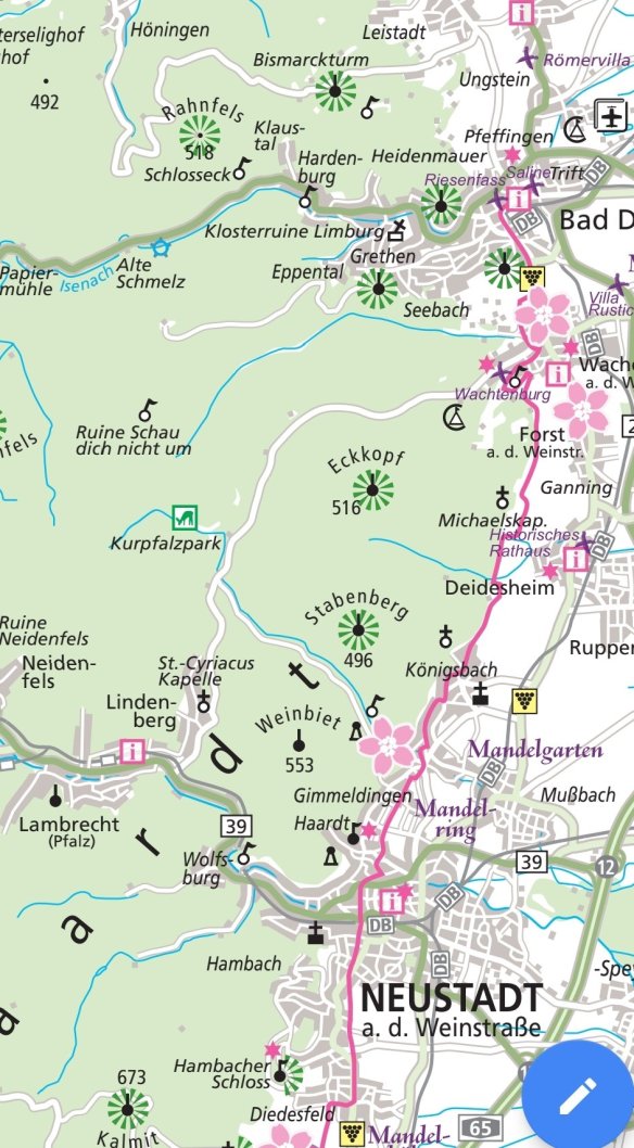 今天選的是Neustadt an der weinstraße這個城市,是杏花道中間。雖然有官方網站,但是具體位置實在不好找。最後還是看Google Map的塞車路段加上尋找酒莊位置才找到。