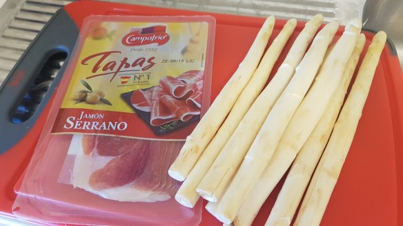 窮上班族決定吃好一點,從一包0.99的德國火腿,改買一包1.29的西班牙火腿,西班牙火腿果然比較好吃,搭配白蘆筍還是不敗組合。