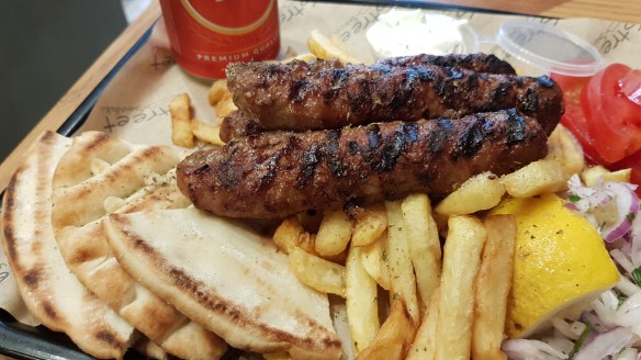 晚上我的半分番茄黃瓜沙拉,加上兩根牛肉串燒。本來就是不想吃澱粉,想不到還是送餅皮。半分沙拉超大盤,上面有一塊鹹鹹的Feta起司。