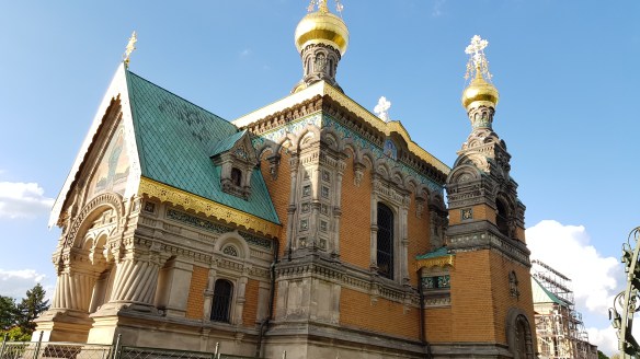 這邊另外一個有名的是東正教教堂 Russische Orthodoxe Kirche der hl. Maria Magdalena Darmstadt。黑森大公與俄羅斯沙皇關係不錯,末代沙皇在1894年在聖彼得堡冬宮娶黑森大公國的維多利亞·愛麗絲·海倫娜·路易絲·比阿特麗絲郡主(Victoria Alice Helena Louise Beatrice)。二人於一個婚禮上彼此一見鍾情,尼古拉二世也多次來到 Darmstadt,這個教堂就是尼古拉二世送給Darmstadt的。