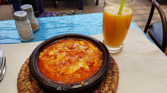 我點了塔吉鍋(總是該吃一下) 45 MAD。加上現榨柳橙汁 15 MAD,算是還可以。網路上這間評價只有1.8分,還好東西還不錯吃,也沒有被多收錢。