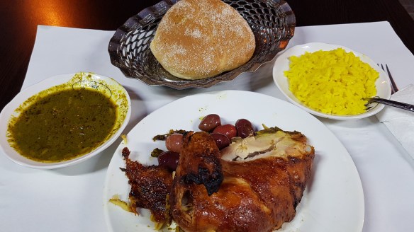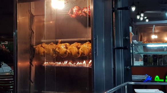 這個1/4烤雞是25MAD比起大街上動輒70-100MAD的餐點便宜,店員現場從烤箱裡切下1/4再放其他部分回去。衛生狀況不是特別好,例如店員切雞手直接放在雞上,不過比其他真正當地人的餐廳裡的蒼蠅滿天飛,這樣算是可以接受啦。