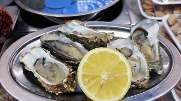 在生蠔攤旁邊繞了幾圈,只有一個客人外帶。鼓起勇氣問了價錢,一個10 MAD跟網路說的一樣,店家也說在這邊吃沒關係,於是就點了五個,只有檸檬沒有調料,真的好好吃,可能是我吃過最好吃的生蠔也未必。