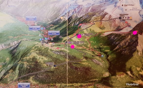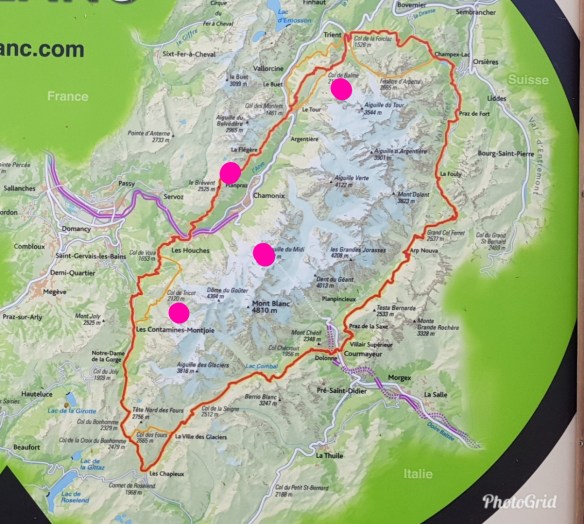 後來果然看到白朗峰環山團的地圖,果然非常驚人。包括今天他們要爬的Col du Tricot ,步道編號33。他們今天到達Col du Tricot 山頂後,是要跨越到另外一頭Les Contamines Montjoie,已經是夏慕尼之外了。