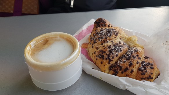 船上有餐桌還蠻舒服的。我們點了外帶的卡布奇諾,即便是外帶還是很小杯。之前再威尼斯就知道,其實很多義大利人是到咖啡吧點Espresso(吧台價比較便宜)加麵包當早餐的。