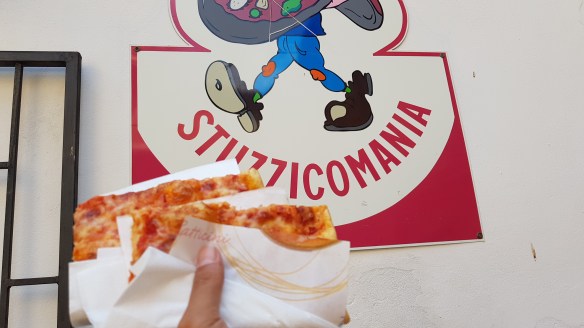 到了Intra,我們用Google搜尋Pizza,找了一間分數最高4.5分的店。以為是現烤披薩,但是其實是烤好的的分切披薩。索性是厚皮版本,加熱後也不錯吃。