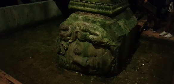 地下宮殿西北方有兩座石柱底座是用刻有梅杜莎面貌的石柱來支撐。這兩座底座來源不明,曾被認為是從古羅馬時期建築拆除後所移置於此。目前沒有書面證據可以證明。一般學者認為梅杜莎頭像被放置倒向只是大小適合以支持石柱。