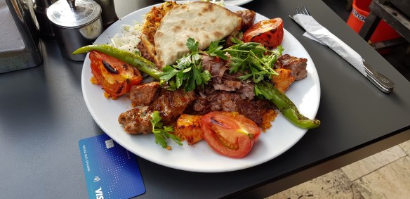想說最好晚餐不要在觀光區,就在這邊點了晚餐,選了一個菜單裡有烤肉跟蔬菜的菜,想不到竟然要63里拉。不過還好這個菜應該就是這麼貴,因為超大一盤,有沙威馬Kebap、烤牛肉串、烤雞肉串、土耳其披薩Pide、烙餅、以及沙拉。為了讓照片看出大小放了一個比例尺。