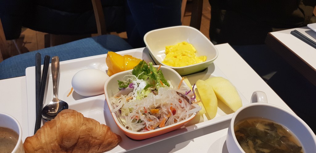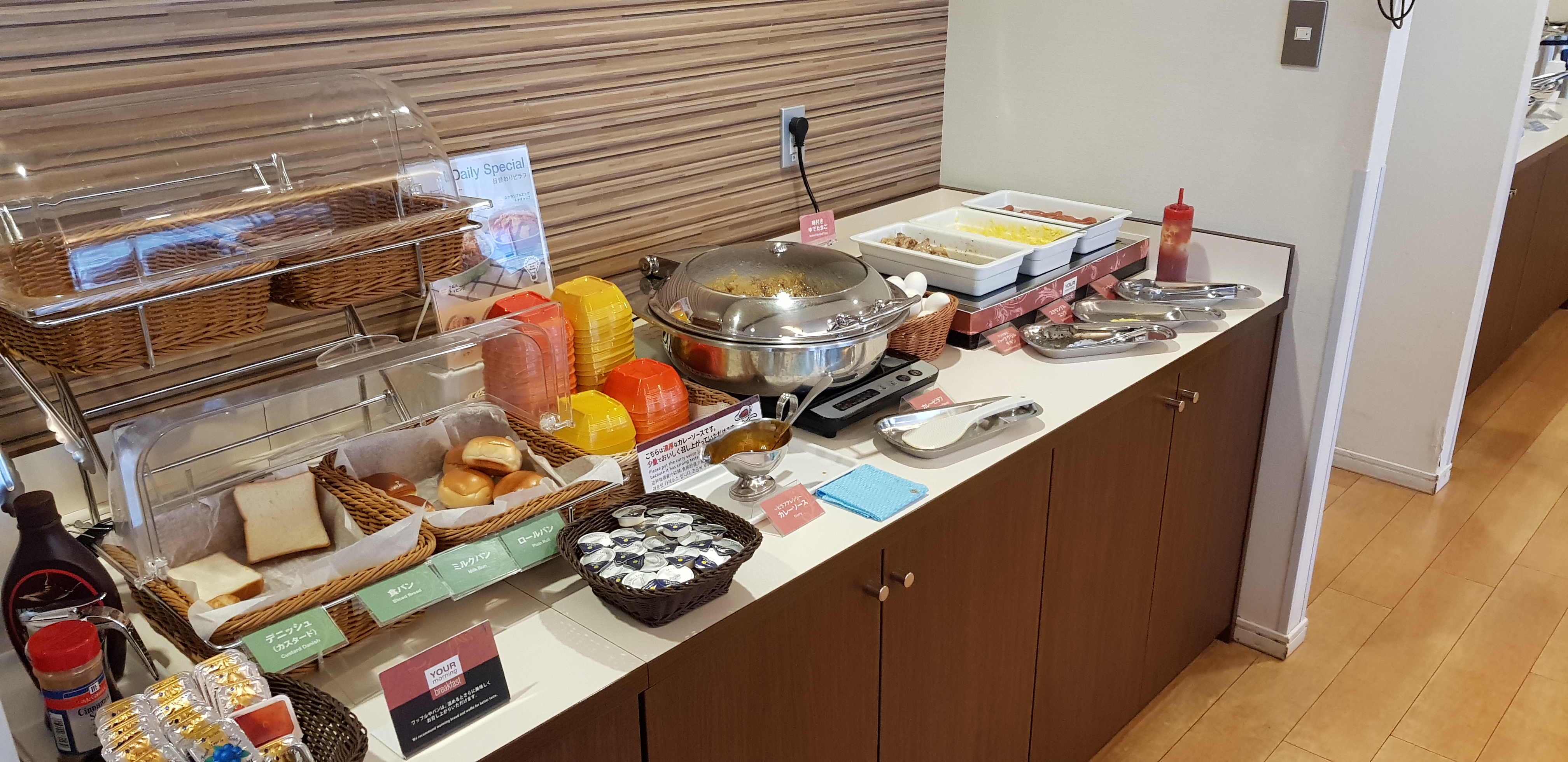 早餐則是與全日本的Comfort旅館一樣,主餐有炊飯、滑蛋、咖哩可以自行與雞肉熱狗組合。沙拉是日式風格,還有水果、湯、飲料、麵包等。面向全房間都無料供應,就不用為早餐傷腦筋了。
