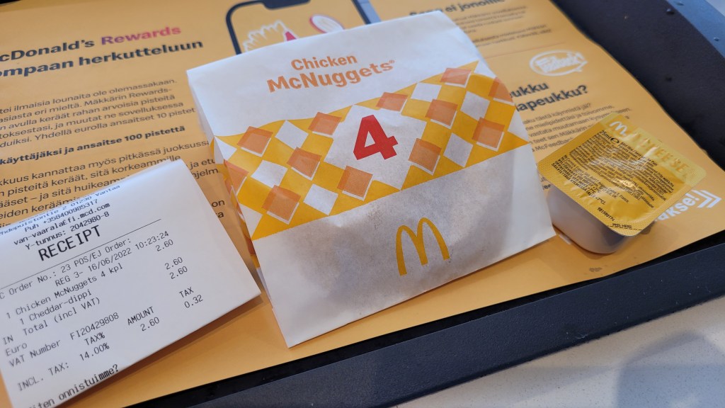 取車時間太晚,到麥當勞吃早餐的計畫落空,倒不是餓,就是想嚐嚐世界各地的麥當勞。後來買了個四塊雞塊2.6€。醬料有五種,我選巧達醬。