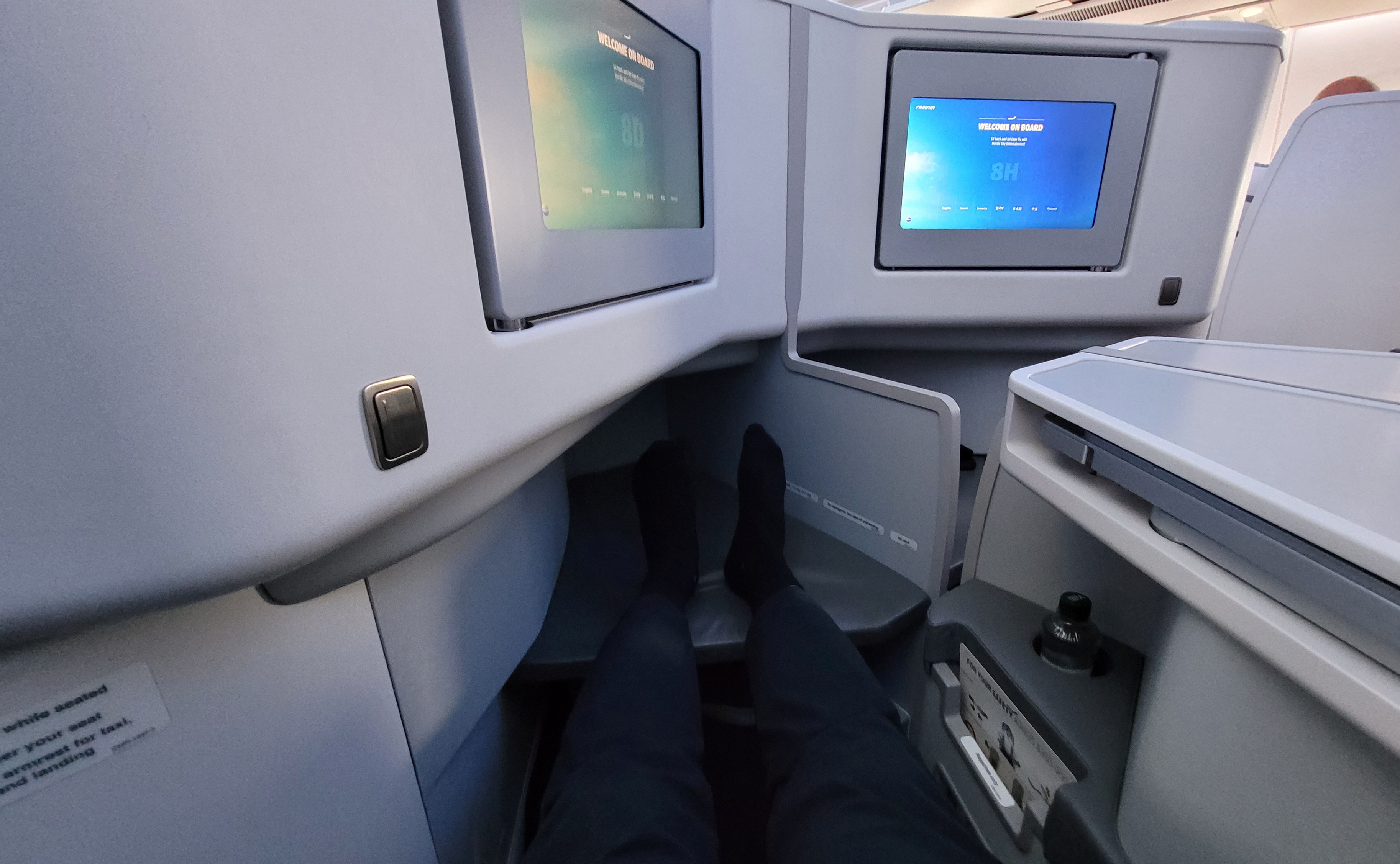 腳長長不用說,耳機倒是非常普通,丟棄式的那種,座位上原本放抗噪耳機的位置,當然就空空如也。