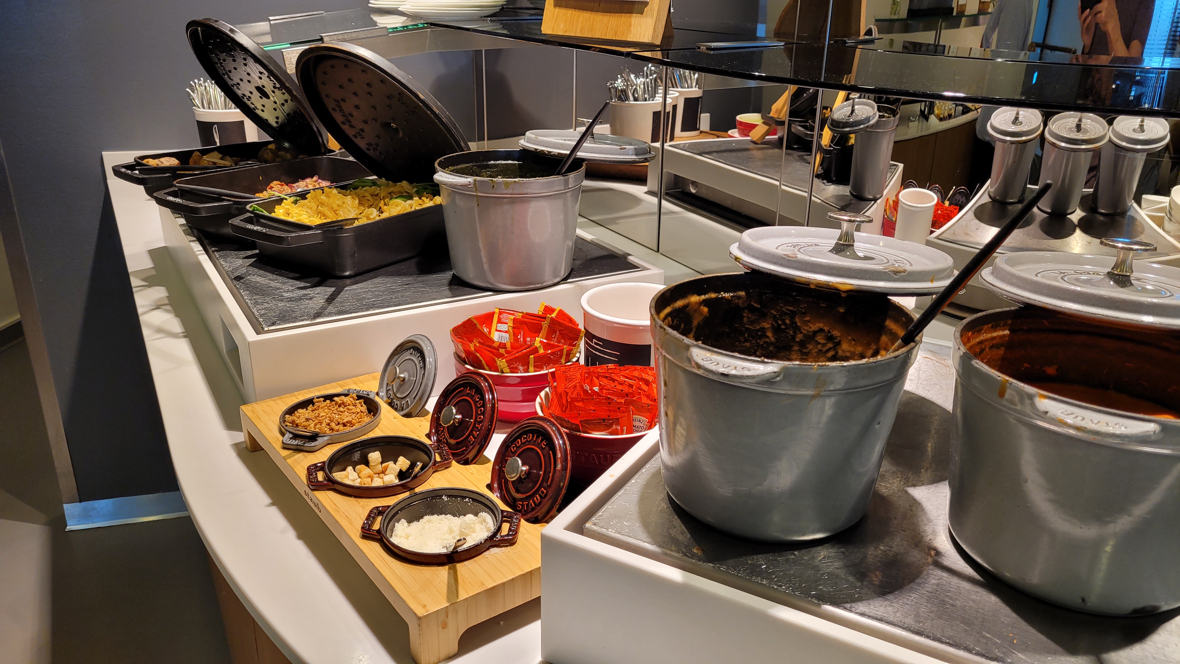 熱食主力是馬鈴薯跟義大利麵,有兩三種醬料可以使用。旁邊還有紅紅不知道是什麼的湯。