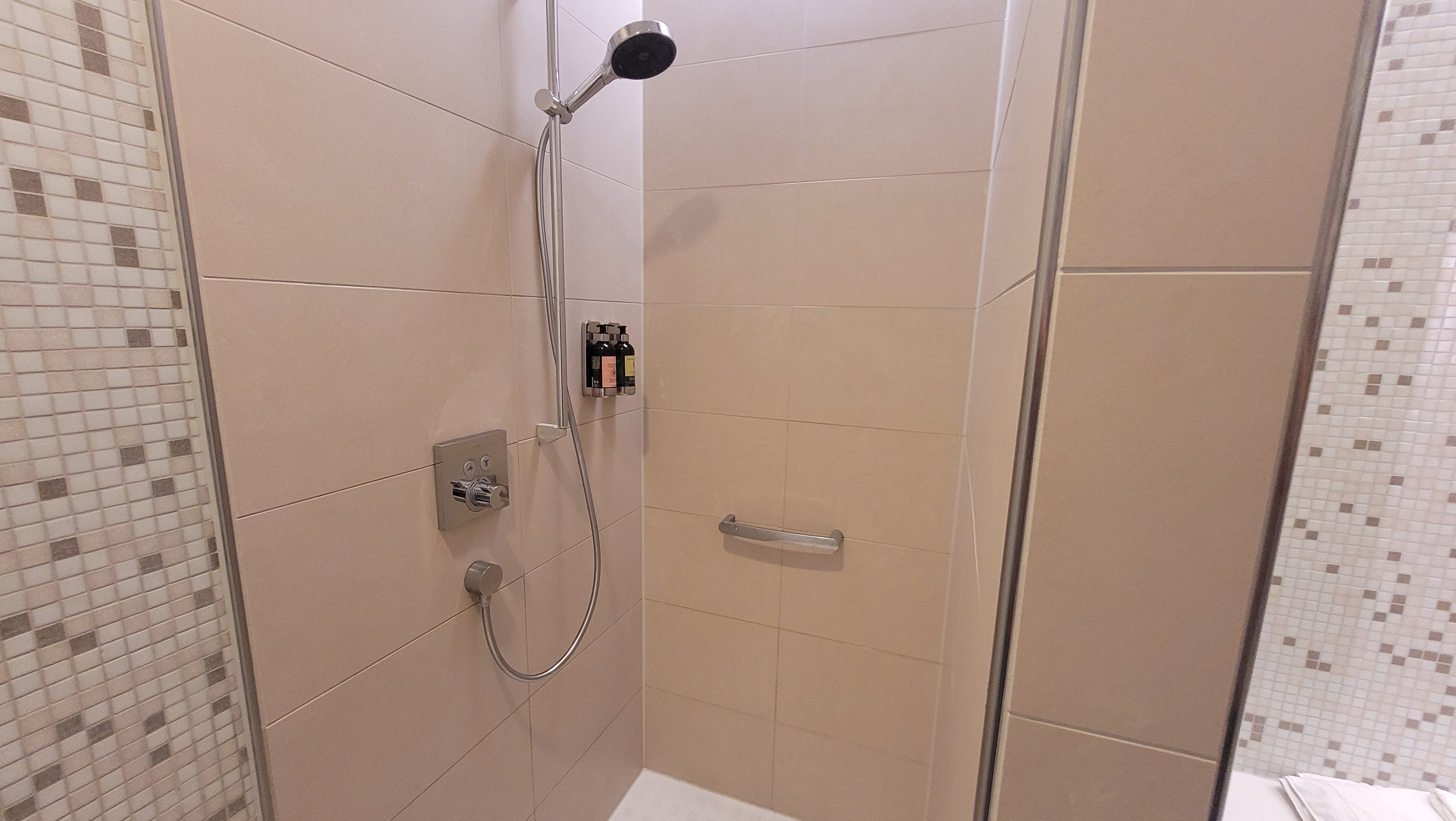 洗澡順便換衣服,不用等。洗澡間意外地很大間,放行李完全足夠。旁邊還有一間SPA,不知道是不是給頭等的。