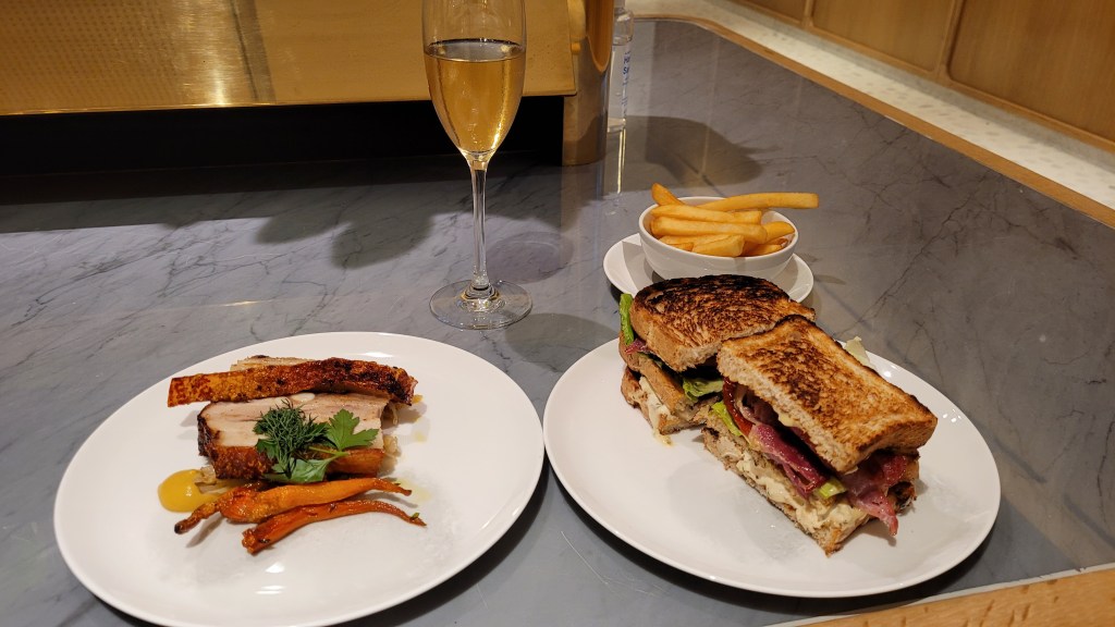 現點的菜色,那還真是不錯,跟國泰頭等貴賓室現點差不多。招牌的公司三明治(據服務人員說),做到內餡不柴麵包現烤酥脆,跟國泰和牛漢堡完全可以比肩。