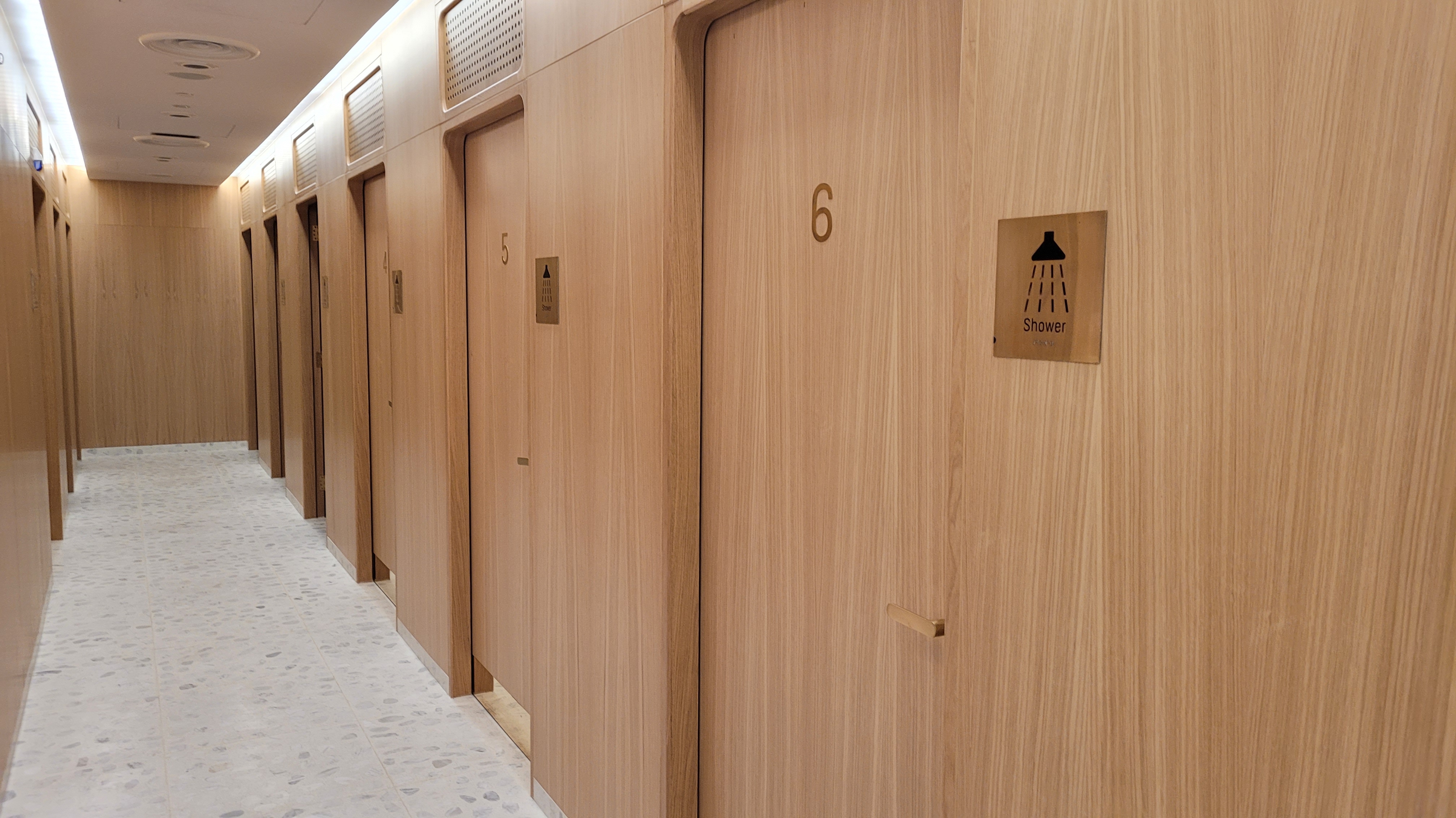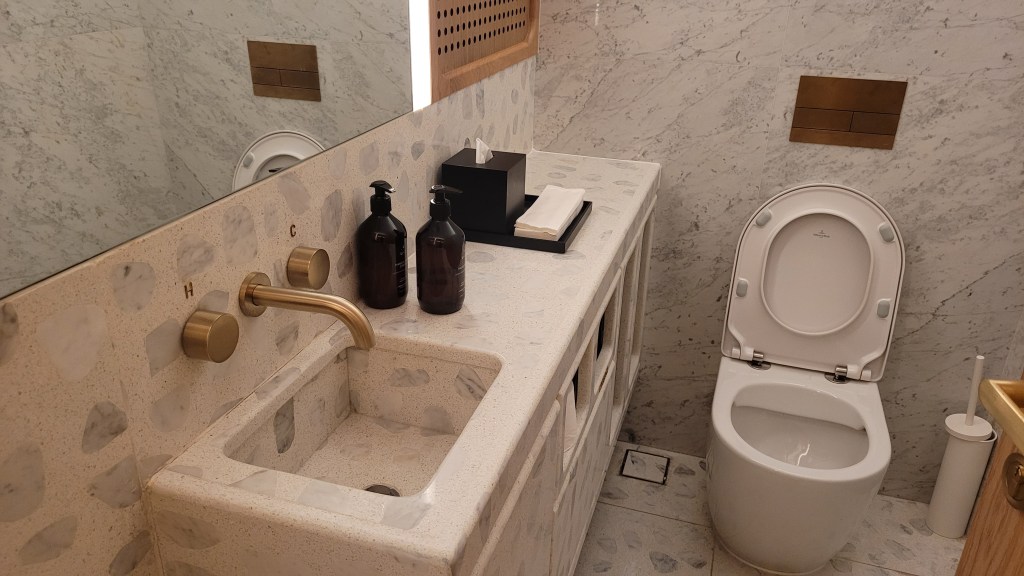 也沒時間洗澡,不過廁所也蠻值得一提。男生廁所竟是一人一間這種,裡面的大理石還是承襲低調奢華的風格。