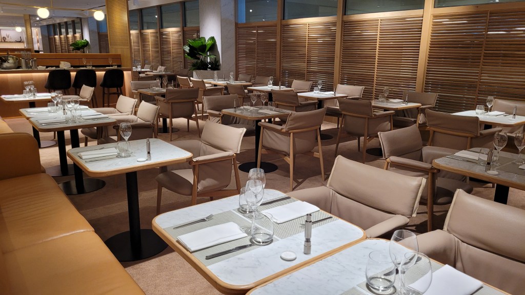 也因此這裡都是西方人,氛圍就像是澳洲的酒吧一樣。本來以為會有像國泰或日航或英航主場頭等那種特別的設置,例如:吃到飽或按摩或十幾種酒之類的,結果完全不是。設置極其簡單,就是像餐廳一樣,靠七八個服務人員提供桌邊服務為主而已。