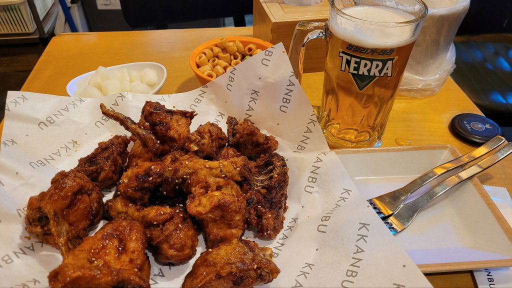吃了旅館旁邊的KKANBU,招牌蒜味烤雞口感完全不輸炸雞,我願稱之為韓式炸雞第一。最後一晚還自己跑來炸雞配啤酒。