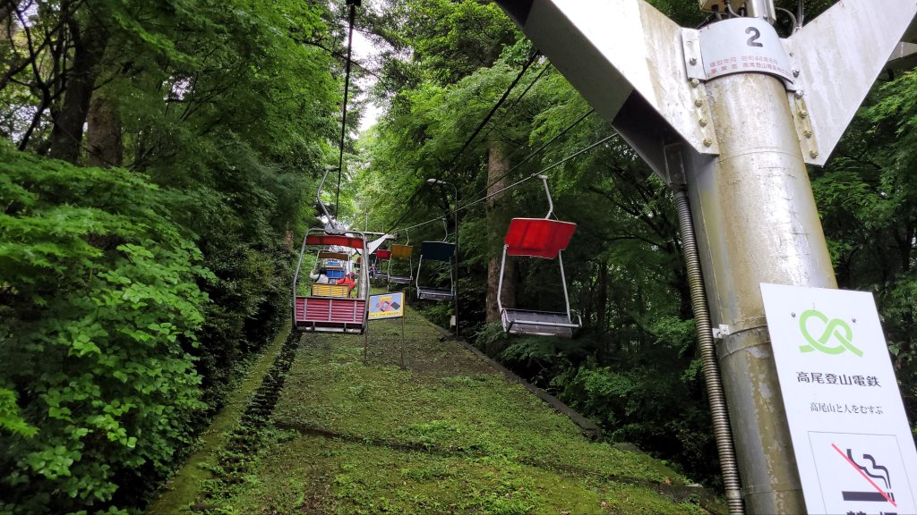 步行到高尾山纜車站,有座椅跟列車兩個選擇,座椅跟滑雪纜車很像,上下要一點小心。景觀很不錯,不過沒有扶手。