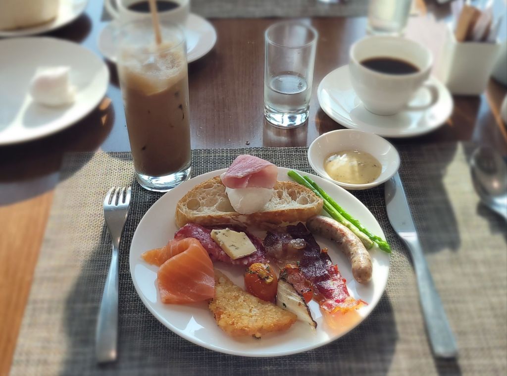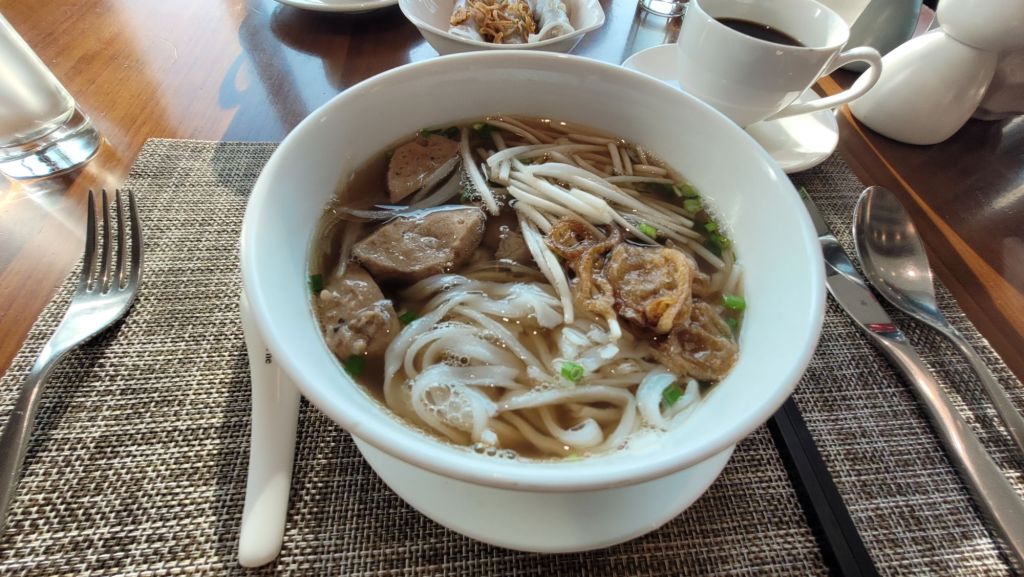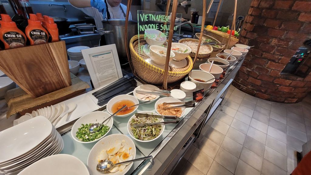 有越南河粉Pho、越南春捲、椰子汁、越式咖啡可以一次吃到。蛋攤甚至有班尼迪克蛋,培根是美式那種乾乾脆脆的,不消說當然是比較好的選擇,很滿意。