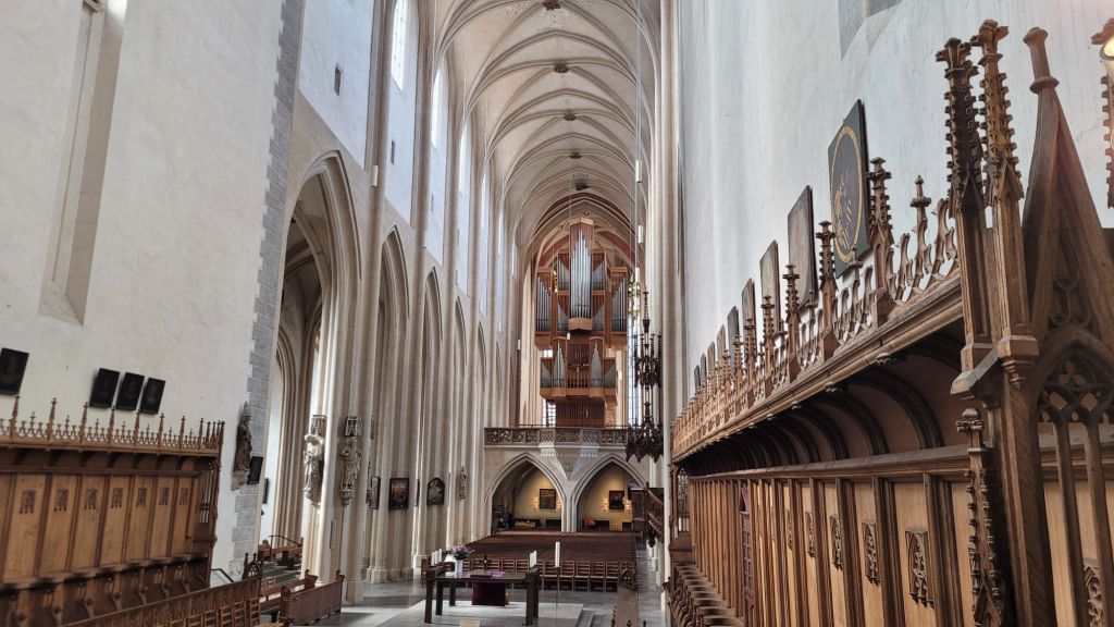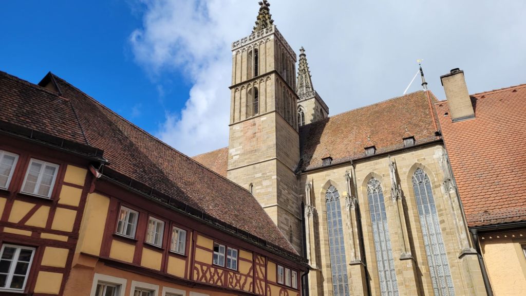 Wiki: 聖雅各教堂依照哥特風格所建。教堂東端供祭司和唱詩班使用的聖壇最先建於公元1311年至1322年間。隨後的中央大殿在公元1373年至1436年間竣工,最後西面的聖壇完工於1450年至1471年間。1485年由維爾茨堡主教主持完成落成典禮。