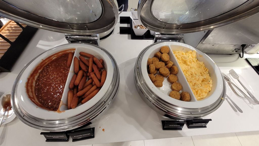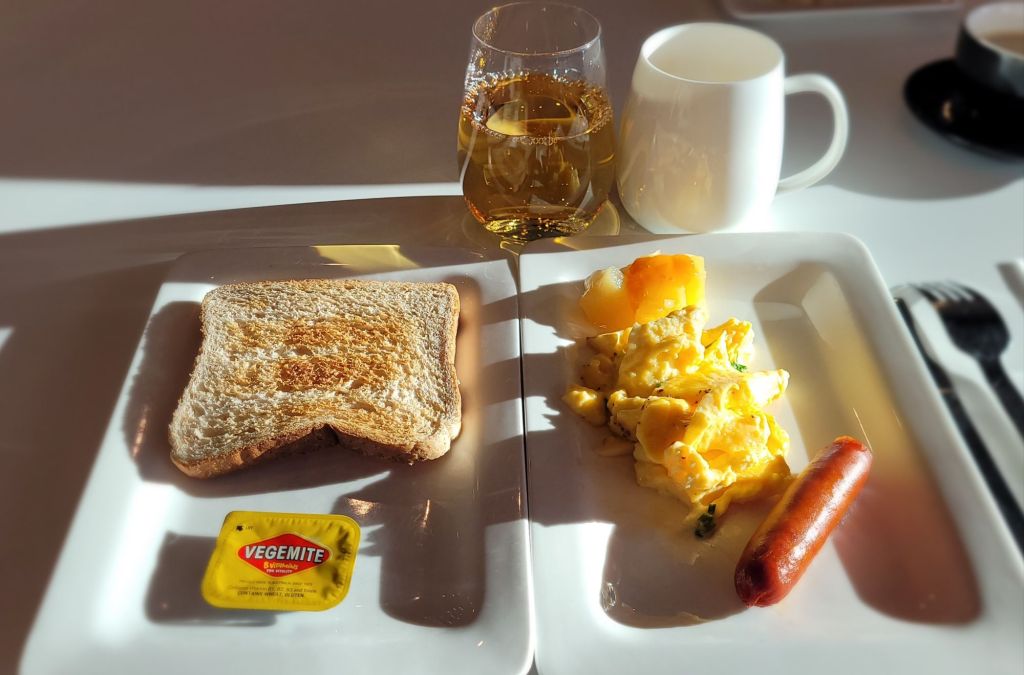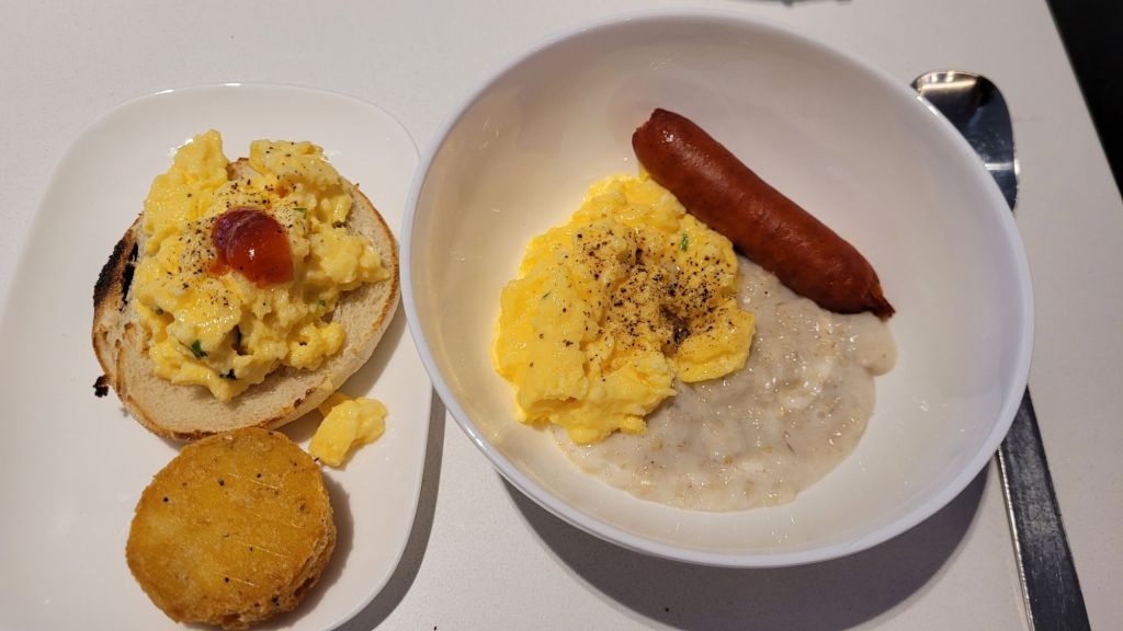 很久沒吃燕麥粥,來個鹹粥版。接續的國內線只有飲料一杯糖果一顆,這邊吃飽喝足毫無負擔。