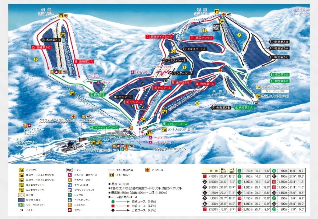 喜樂樂滑雪場擁有22條多樣的滑雪道,從初學者到滑雪高手,都能找到適合自己的雪道。大致上可以分為朝里、長峰以及余市三個區域,每個區域都有著不同的特色。喜樂樂滑雪場的雪質非常好,尤其是粉雪,非常適合滑雪。