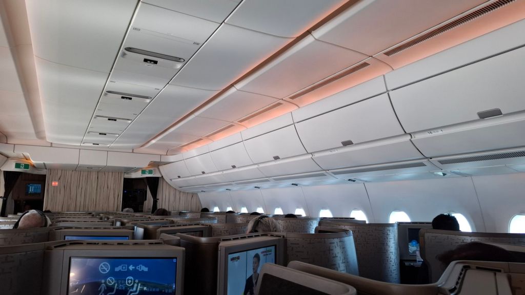 華航A359的空間配置我比較喜歡,比起CX的外掀門,我覺得兩個上掀置物空間更方便。小檯燈也很有質感。
