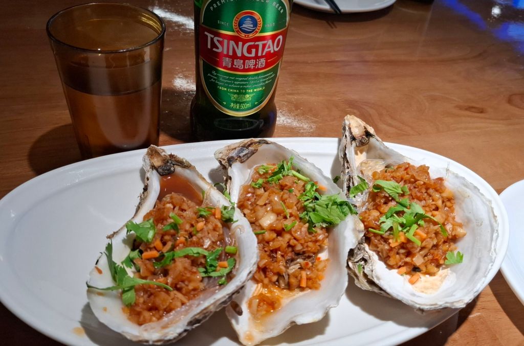 晚餐沒有吃海腸拌飯,而是青島海鮮水餃。再來幾顆肥美的生蠔,配上最新鮮的青島啤酒一廠原漿啤酒,冰涼的啤酒入口,清爽解膩。